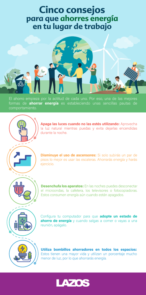 Conoce en la siguiente infografía de Lazos delagente algunas recomendaciones que te permitirán ahorrar energía en tu lugar de trabajo.