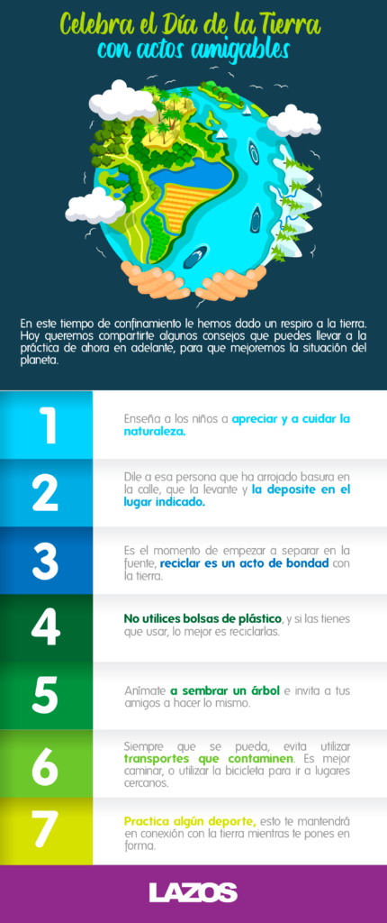 En la siguiente infografía de Lazos delagente te contamos cómo puedes seguir ayudando al planeta después de esta cuarentena generada por el Covid-19. Hoy es una buena fecha para empezar.
