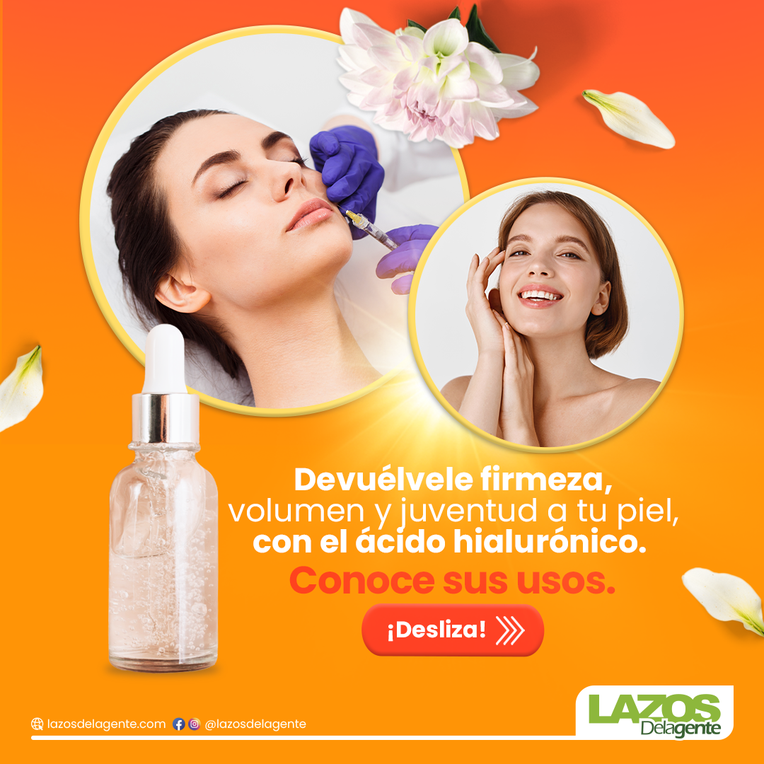 El ácido hialurónico es una sustancia que se encuentra de manera natural en nuestro organismo. En efecto, pertenece al colágeno que se encuentra en nuestra piel y ayuda a mantener la piel hidratada y con una textura tersa y suave. Sin embargo, debido al paso de los años, la presencia de esta sustancia va disminuyendo considerablemente, por esta razón, en el mercado se han lanzado variedad de productos que lo incluyen para que, de esta manera, podamos lucir una dermis hermosa y saludable. Te invitamos a conocer todos los usos que tiene el ácido hialurónico en el siguiente carrusel. ¡Acompáñanos!