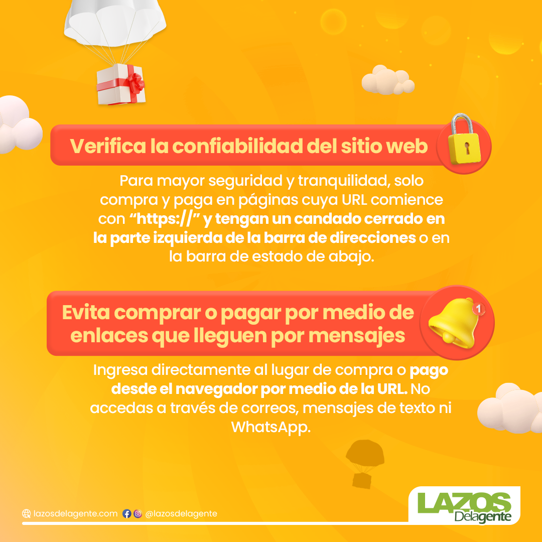 Hoy en la revista Lazos Delagente, junto al experto en seguridad digital Adrián Sepúlveda, te contaremos cómo puedes realizar tus pagos en línea con mayor confianza y qué debes tener en cuenta al momento de hacerlos. Acompáñanos y conoce más, en el siguiente carrusel.