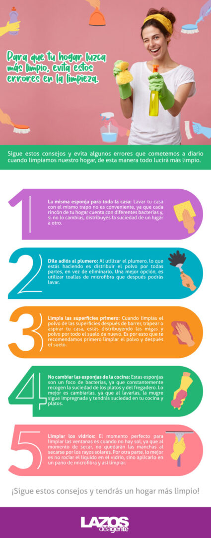 ¿Sabes cómo limpiar adecuadamente tu hogar? A diario, muchos caemos en los mismos errores, desde no limpiar el polvo antes de barrer, hasta utilizar el mismo pañito en todos los rincones de nuestro hogar. Sin embargo, hoy te traemos algunos consejos para que tu hogar luzca más limpio, y evites caer en estos errores. Conoce más en la siguiente infografía.